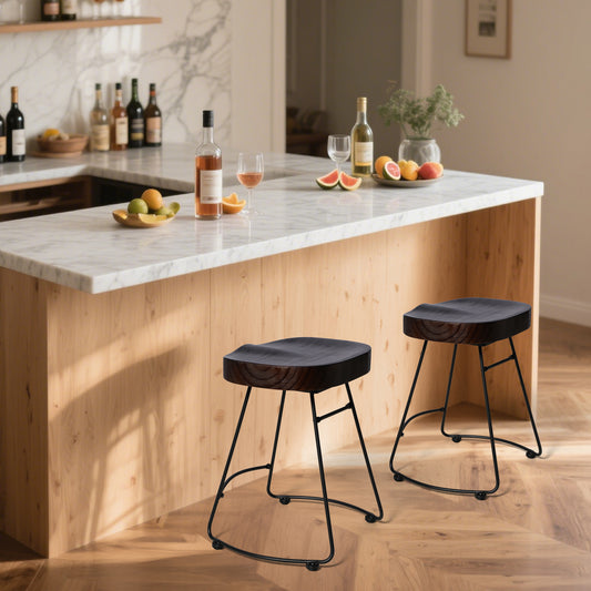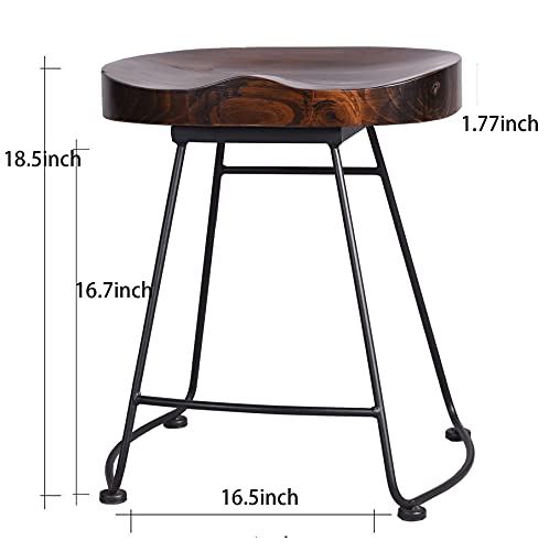 Set of 2 Modern Bar Stools, American Retro Country Style Dining Chairs, Mid Century Wooden Saddle Top Short Bar stool with Tubular Metal Base, 19.29 Inches