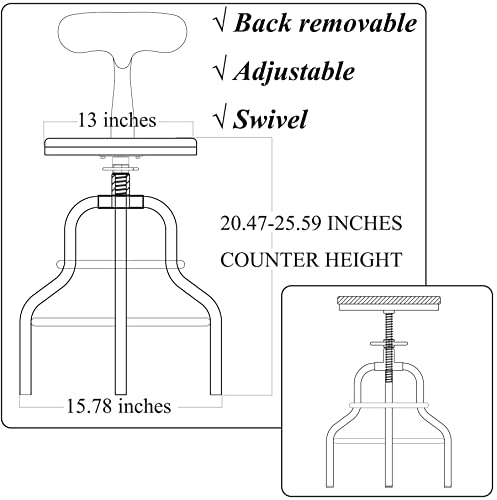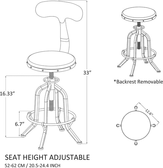 Industrial Bar Stool with Leather Backrest and cushions 21.7-25.6inch Height Adjustable Rustic Swivel Office Chairs Vintage Pub Stools for Kitchen Island Dining Room Living Room
