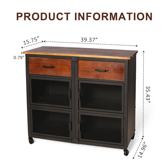 Industrial style storage cabinet with wheels home kitchen storage cabinet against the wall retro tin cabinet living room iron dining cabinet(Black& Wood Top)