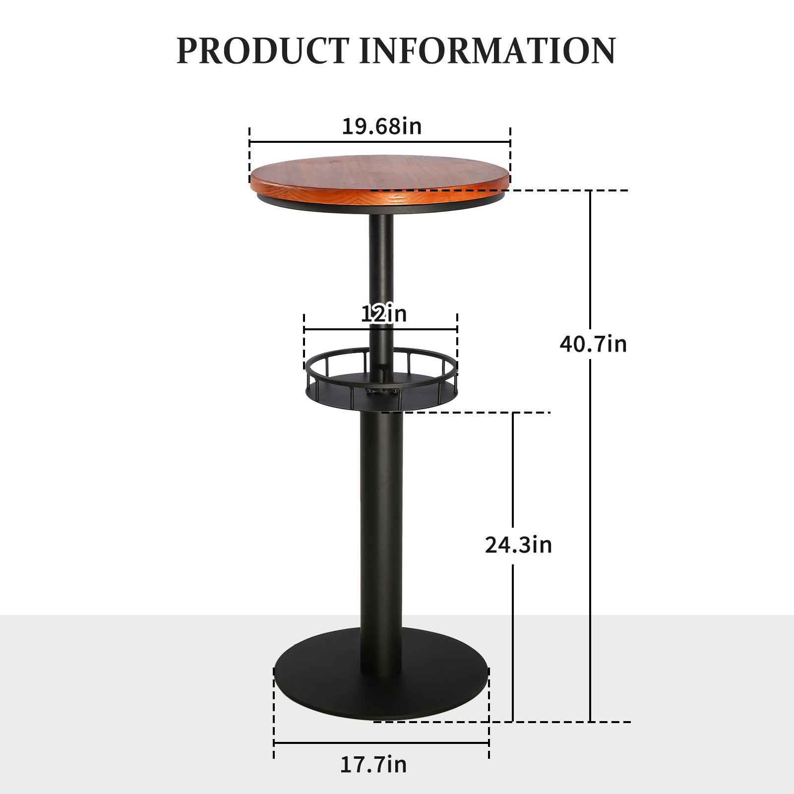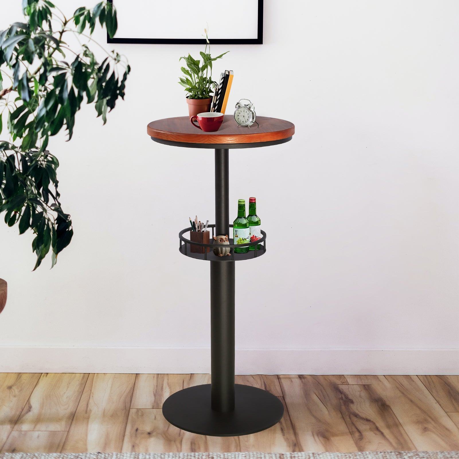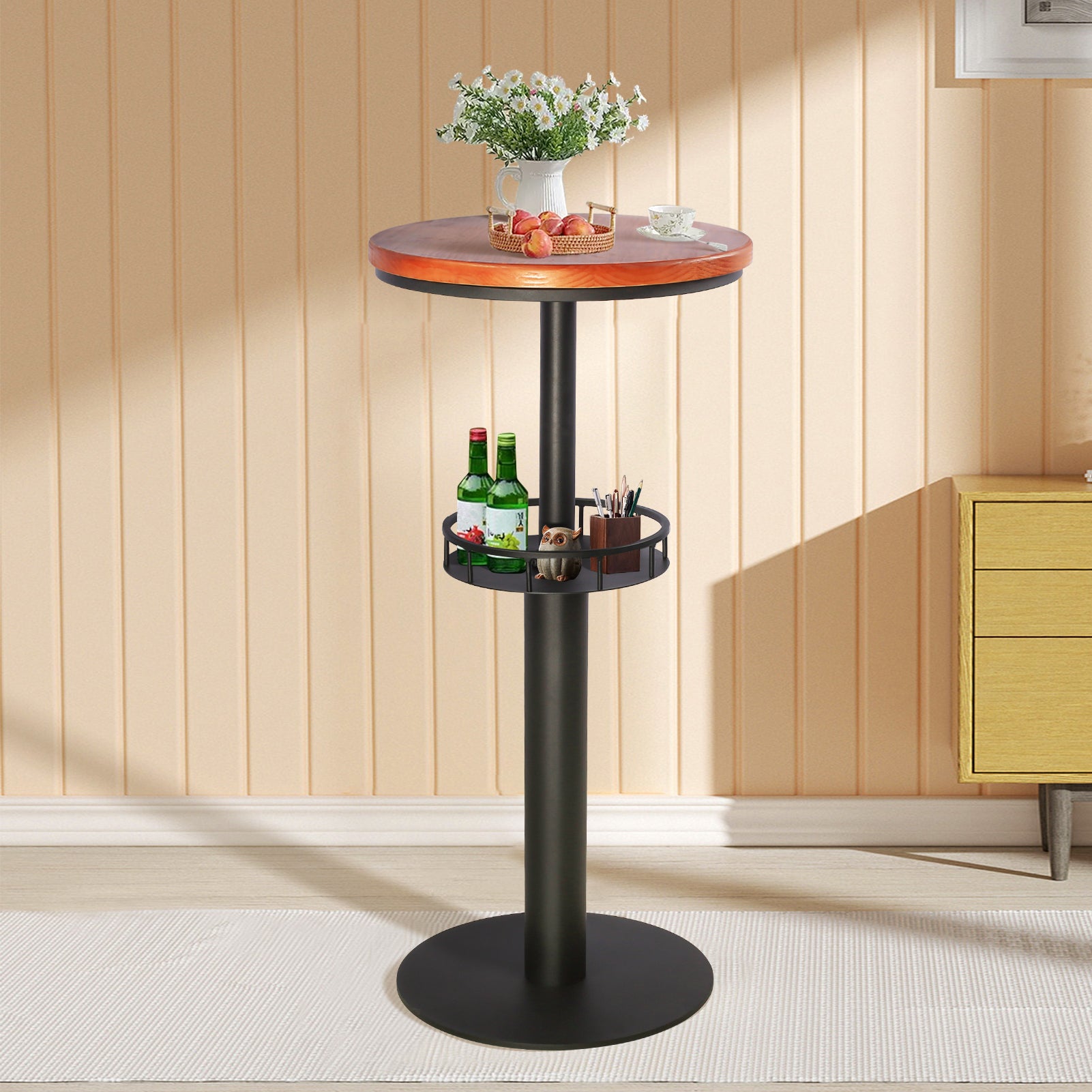 [2 Tier Pub Table] The table is with 19.68inch wooden top and metal shelf. You can place or store some snack, coffee, cup,etc on the metal shelf, which will keep the table top tidy and it is convenient to pick the thing you want.