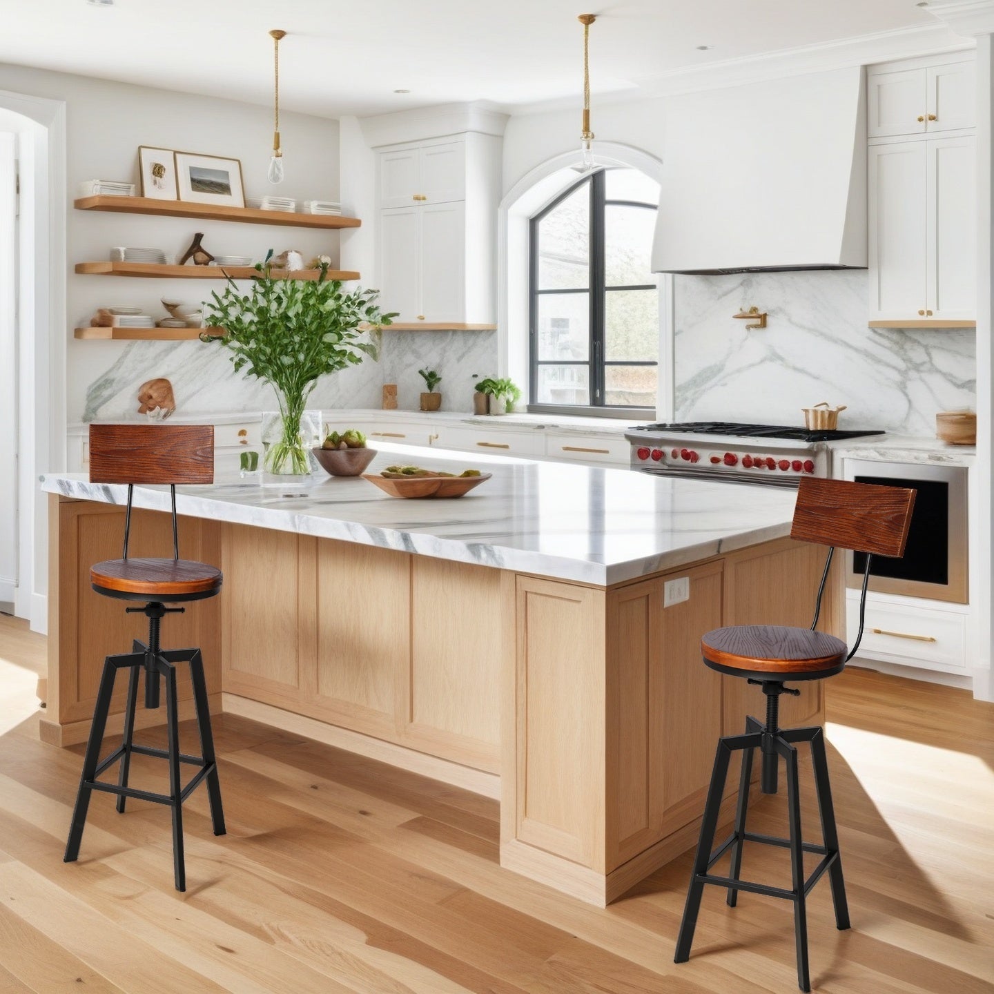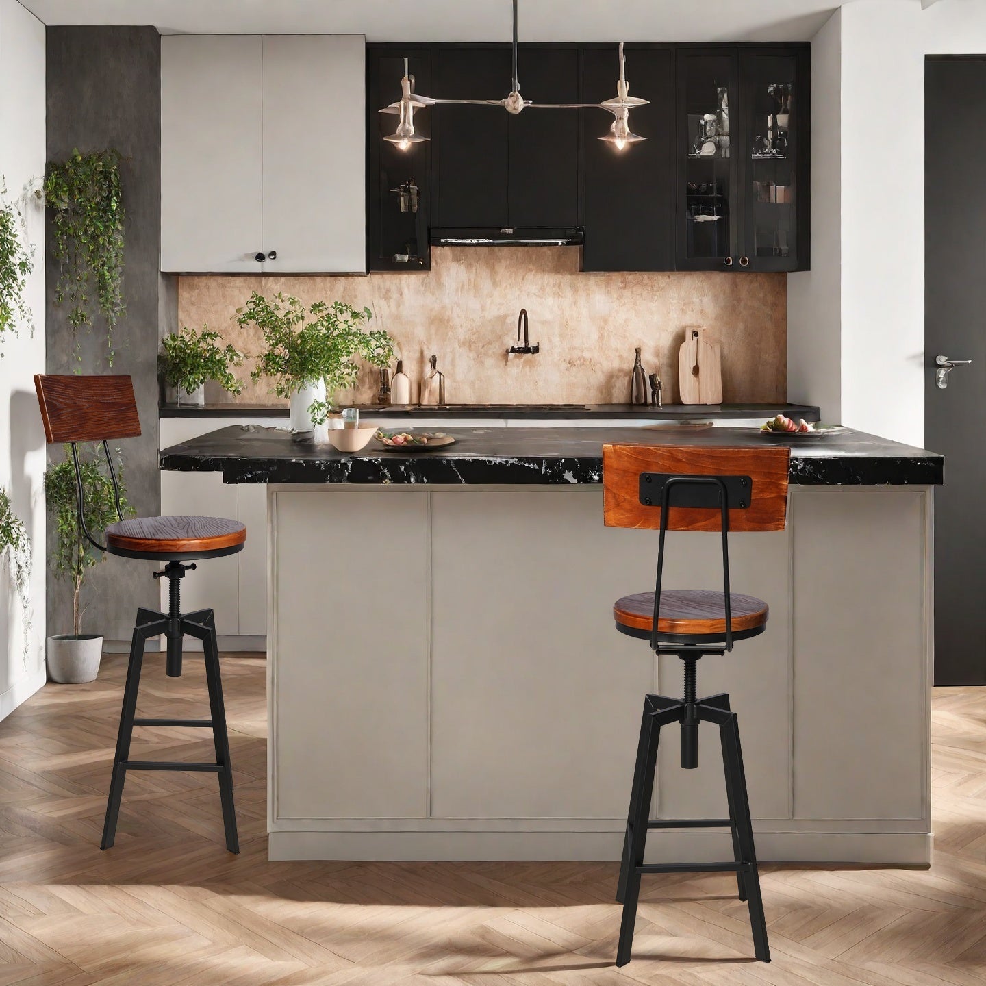 Basking in Rustic Charm: With their warm brown appearance, elegant steel, and arc-backrest detailing, these stools embody industrial style and give a unique touch to the kitchen island or bar counter.