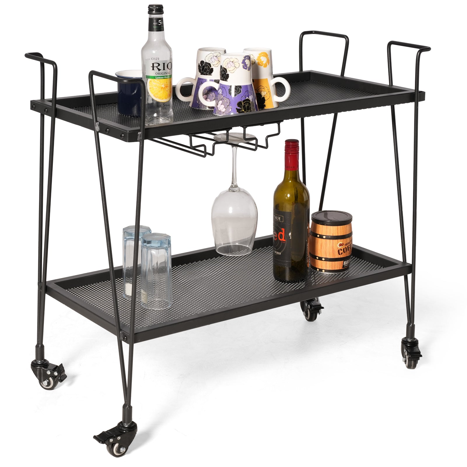 Modern Kitchen Bar Cart on Wheels With wine glass rack Metal Rolling Serving Carts with 2 Tier for Storage Mobile Kitchen Island with Lockable Casters and Side Handle for Outdoor& Indoor(Black)