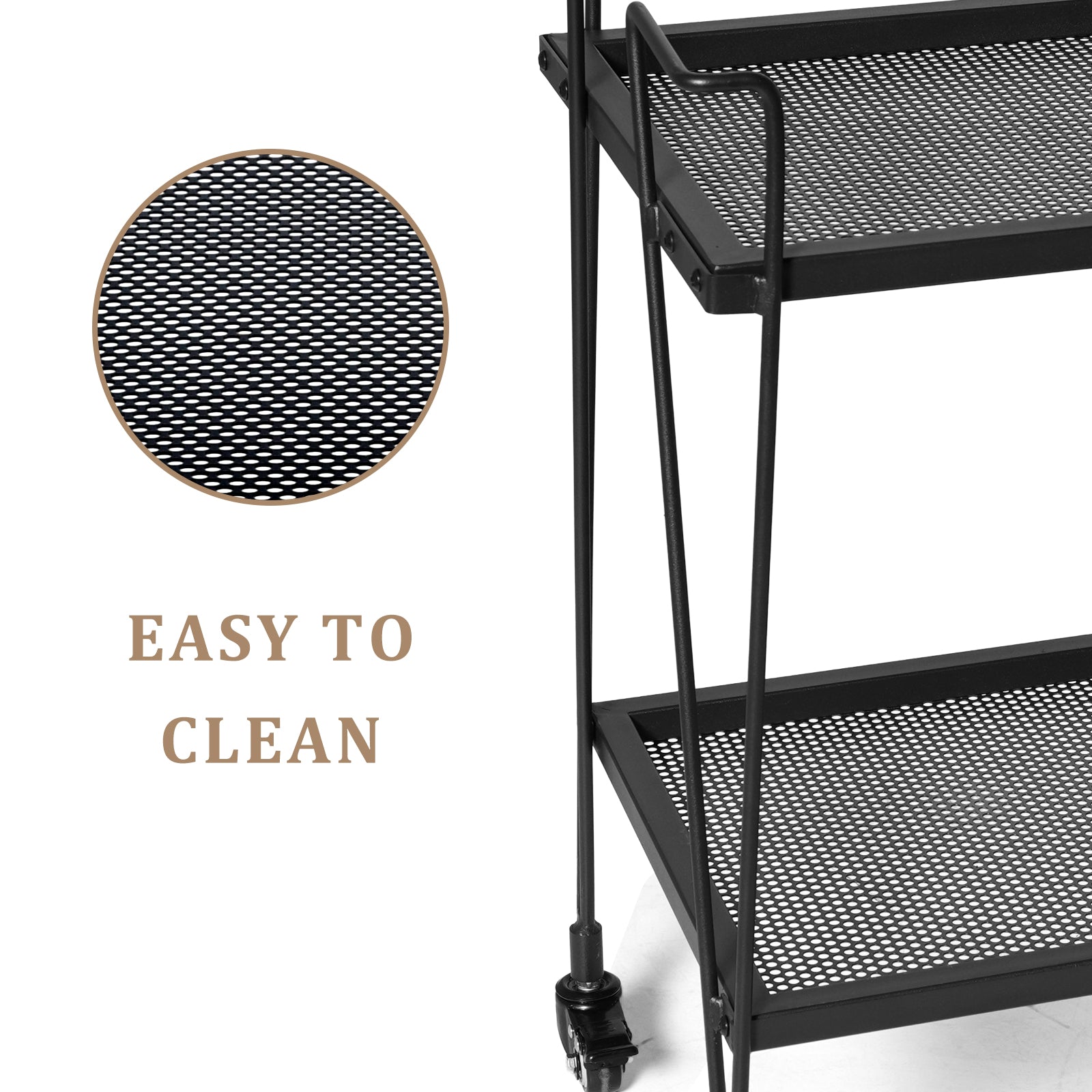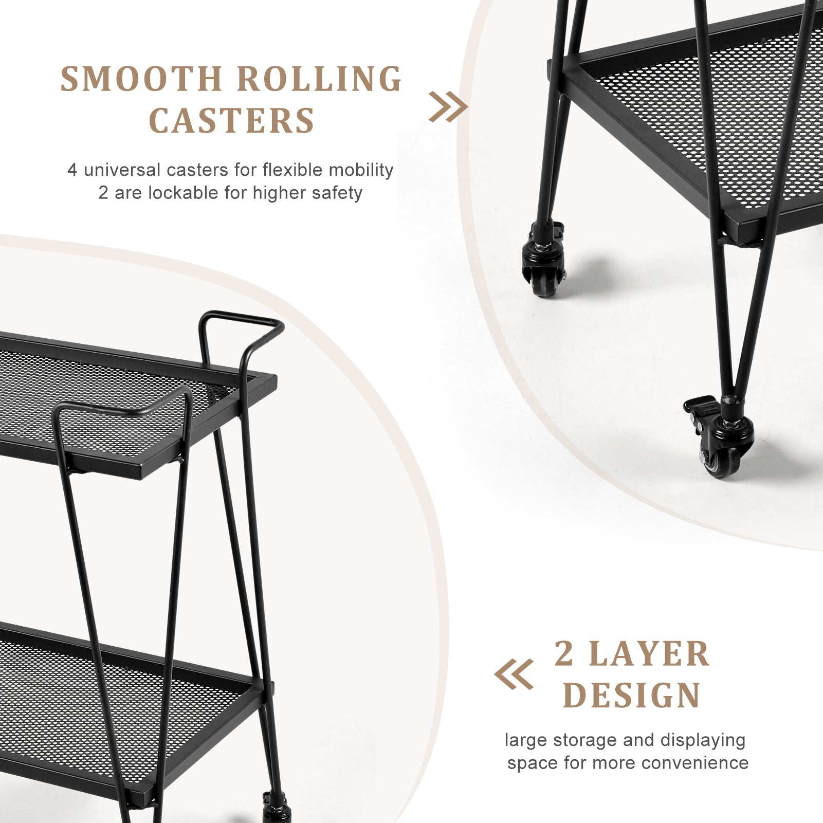 [Sturdy Construction and Durable Material] Made of the iron frame, this kitchen serving cart has great sturdiness, long service time and a great load capacity. And thanks to its high-quality materials, the utility bar cart has a stronger load-bearing capacity to meet your daily use needs.