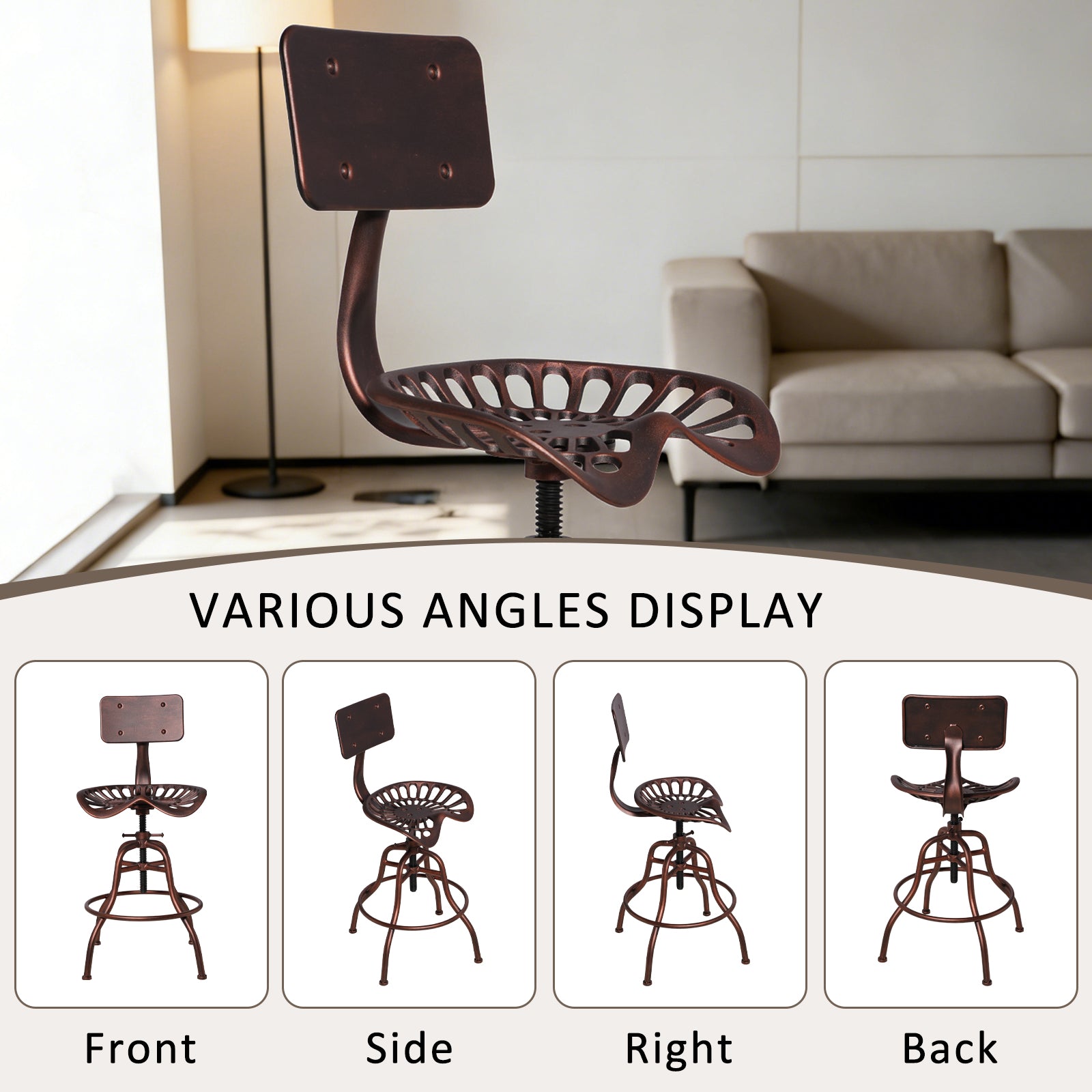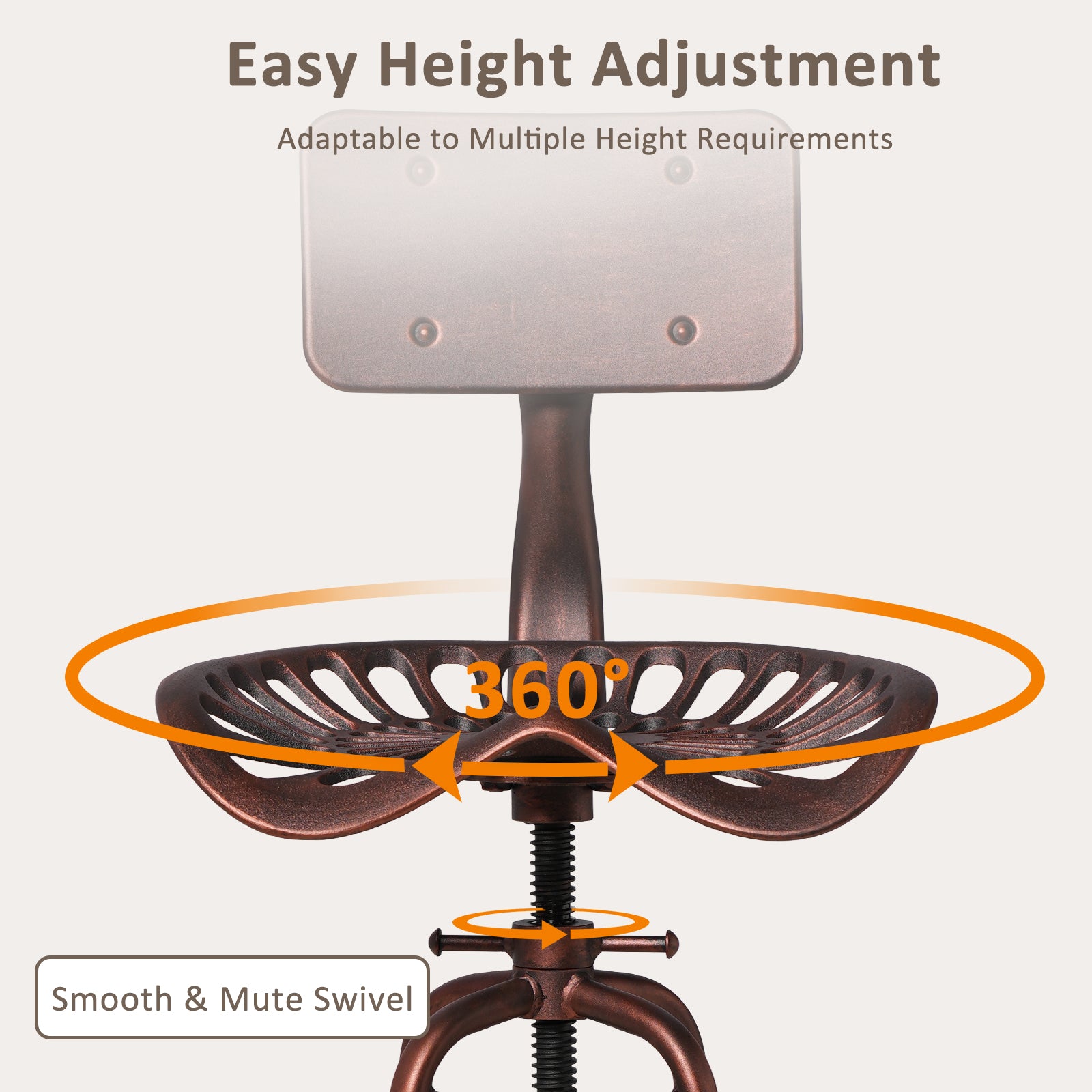 SET OF 1, Adjustable Industrial Home Bar Stools - Cast Iron Tractor Seat Swivel Metal Farmhouse Dining Stools - Counter & Pub Height 22.44" to 27.56" - Copper Finish