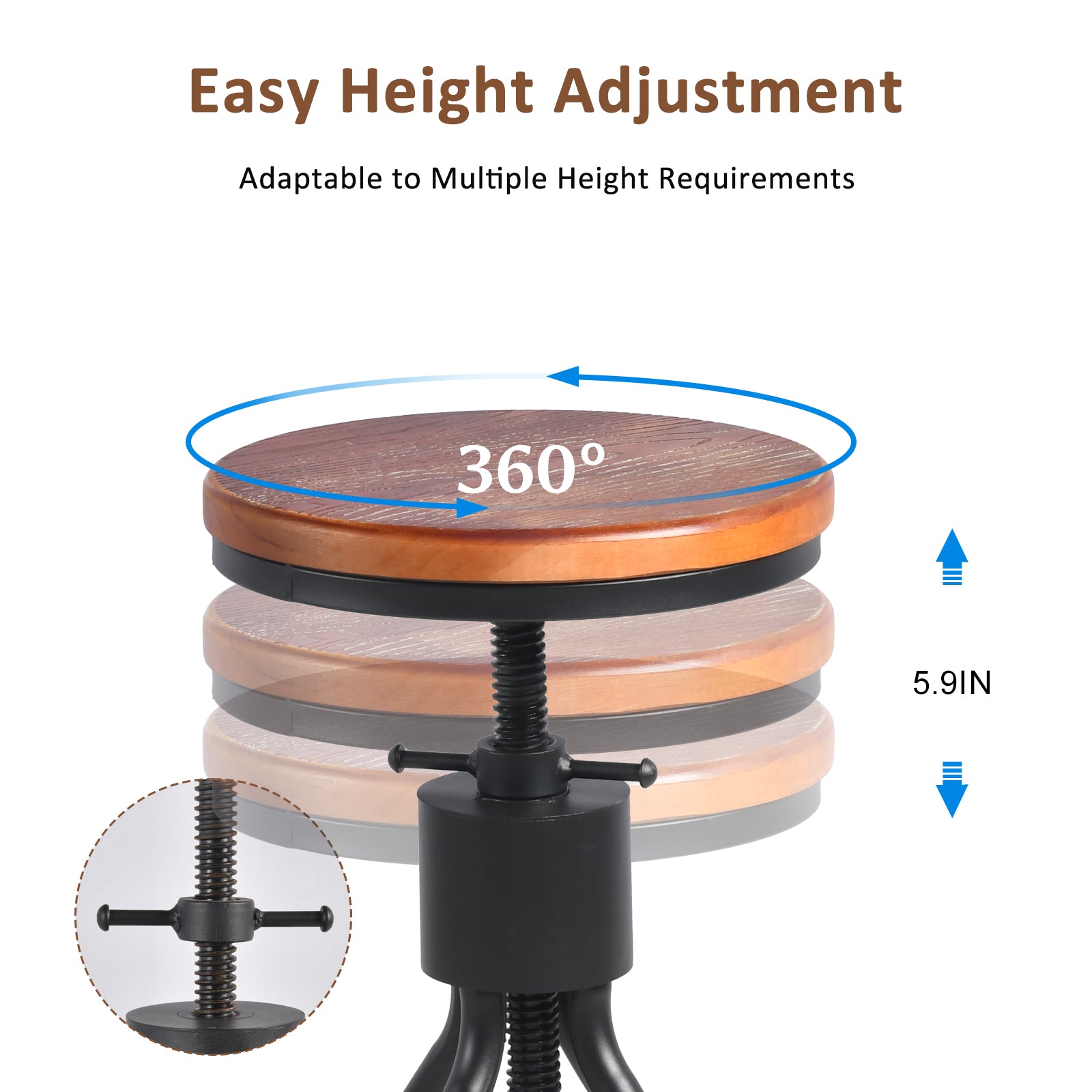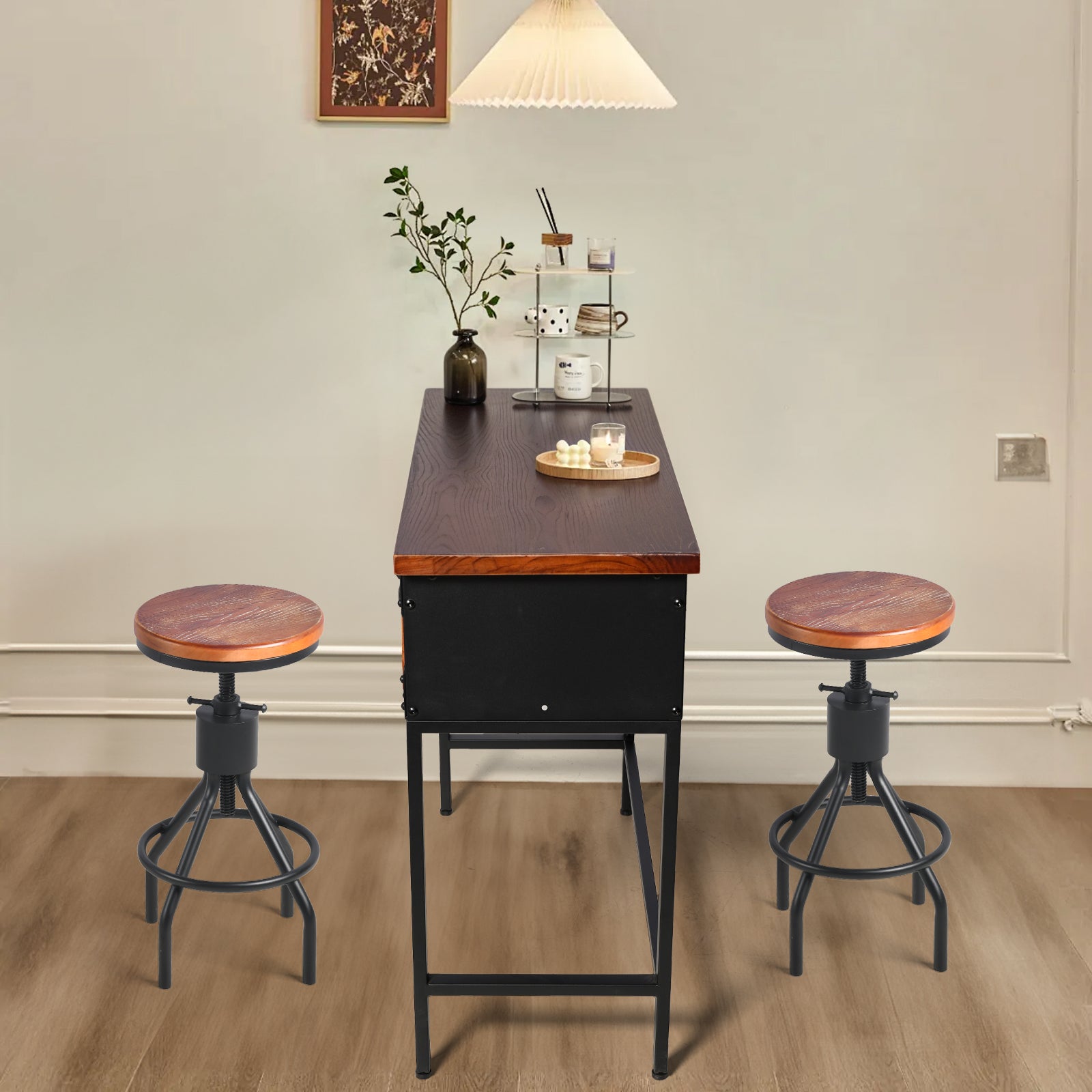 Sturdy & Stable Structure: The Long 39.37'' sofa table is made of high-quality solid wood and a durable metal frame for enhanced sturdiness and a load capacity, making it a reliable piece of furniture for your living room. Equipped with adjustable feet to help stabilize on uneven floors or carpets.Stool Height Adjustable from 23.23 inch to 29.13 inch,is available both as kitchen counter height stool and as bar height stool.Just by spin the seat after loosening the screws.